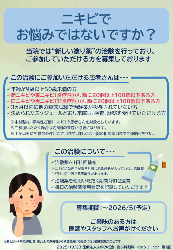 お電話は、当日または、翌日に担当者より掛けなおしさせて頂きます。お名前、お電話番号、診察券番号(あれば)、「ニキビの塗り薬の治験の話を聞きたい。」とメッセージを残してください。