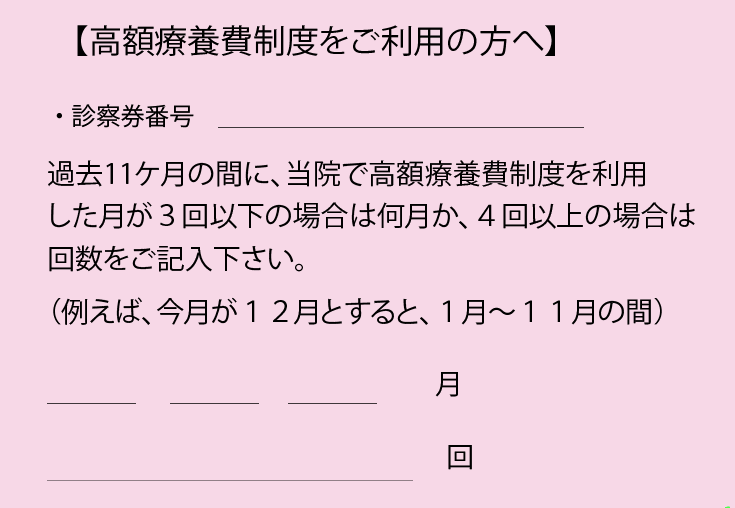 高額療養費制度をご利用の方は、受診のたびに、受付台にある用紙にご記入下さい。