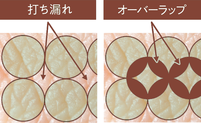 従来のラウンドスポット照射では、均等にカバーすることが難しく、打ち漏れやオーバーラップが起こりやすくなります。