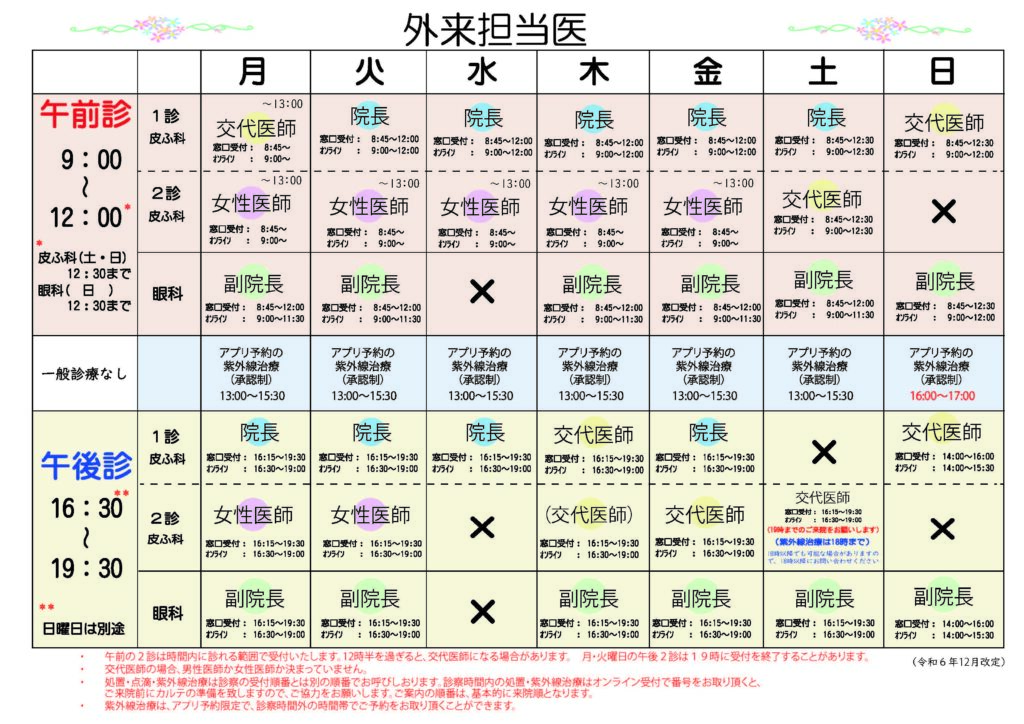• 午前:皮ふ科 1診 日野上・2診 藤本/眼科 副院長