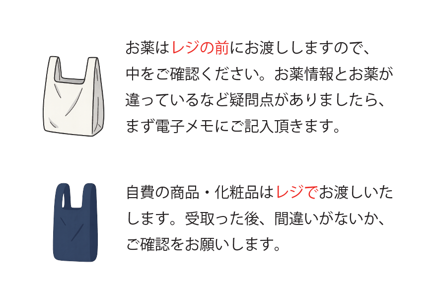 ・お薬はレジの前にお渡ししますので、その場で中身をご確認ください。